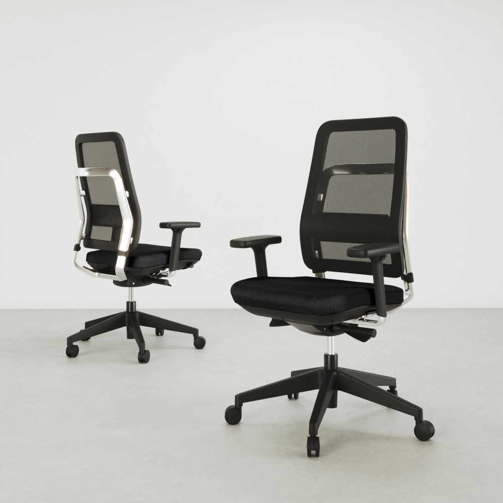 - Schienale in rete nera di poliestere con sottostruttura in polipropilene e 12% di fibra di vetro. Il telaio a vista della contro-scocca è realizzato in polipropilene e 25% fibra di vetro, con finitura nera testurizzata.